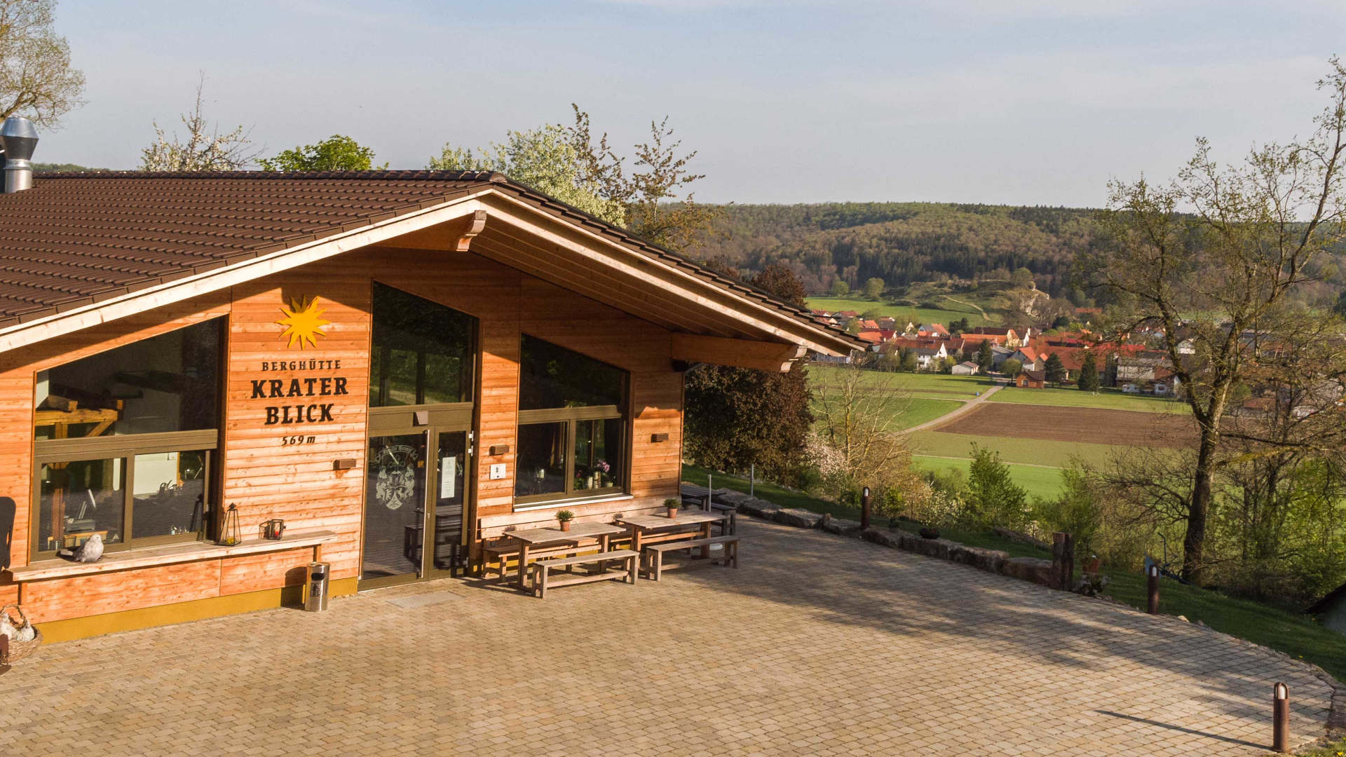 Die Berghütte Kraterblick begeistert mit ihrer einmaligen Naturlage auf dem Zentralhügel des Steinheimer Beckens sowie mit viel Freiraum um die Location herum, der für vielfältige Veranstaltungszwecke genutzt werden kann.